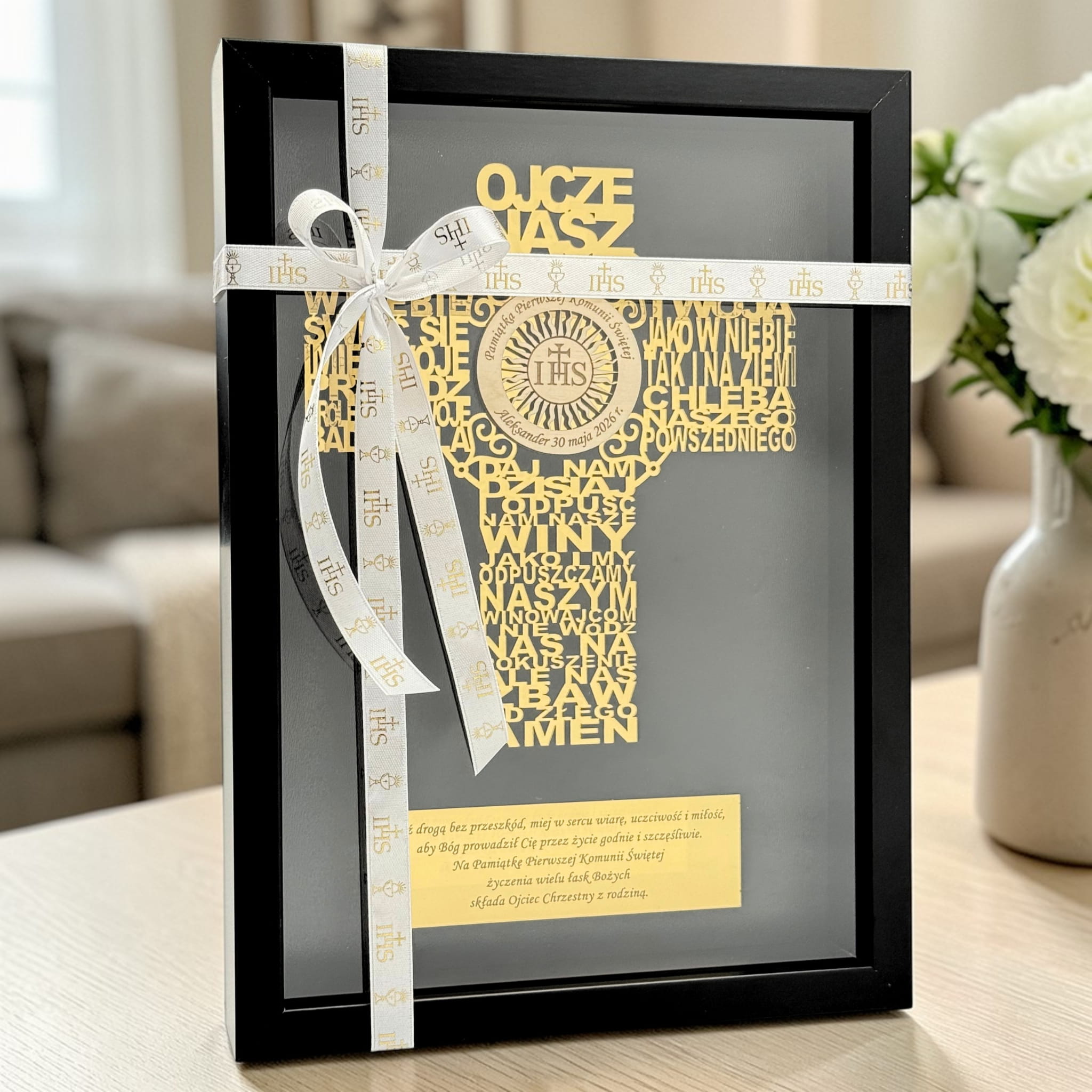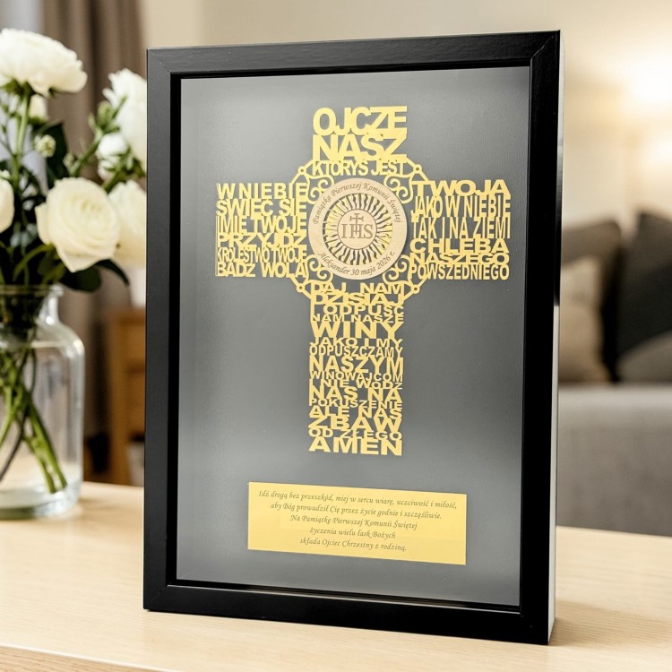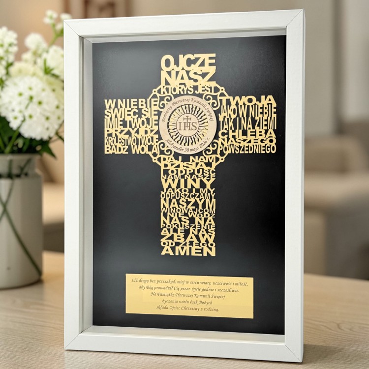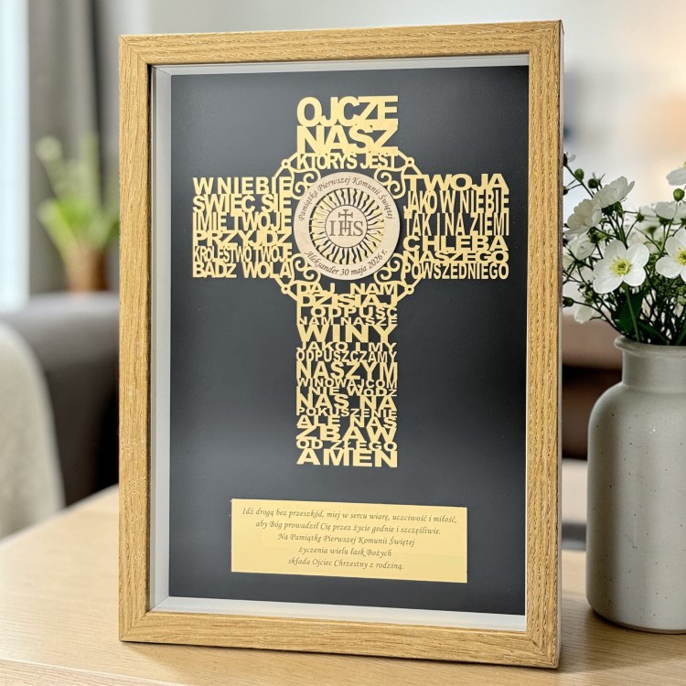 Personalizowany obrazek „Ojcze Nasz” w eleganckiej, głębokiej ramce to wyjątkowa pamiątka Pierwszej Komunii Świętej. Przestrzenny krzyż z wyciętą modlitwą oraz centralna Hostia z możliwością graweru imienia i daty tworzą ponadczasowy, religijny upominek o wysokiej estetyce wykonania. Produkt gotowy do wręczenia – możliwość zawieszenia lub postawienia.