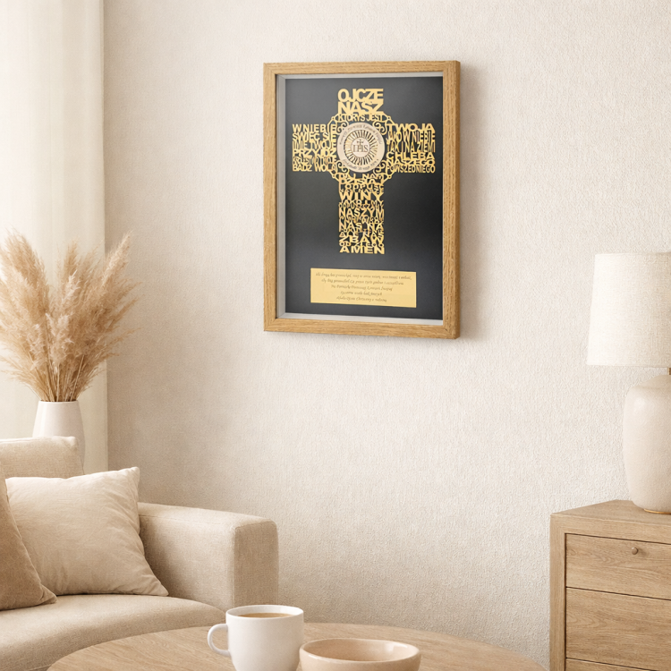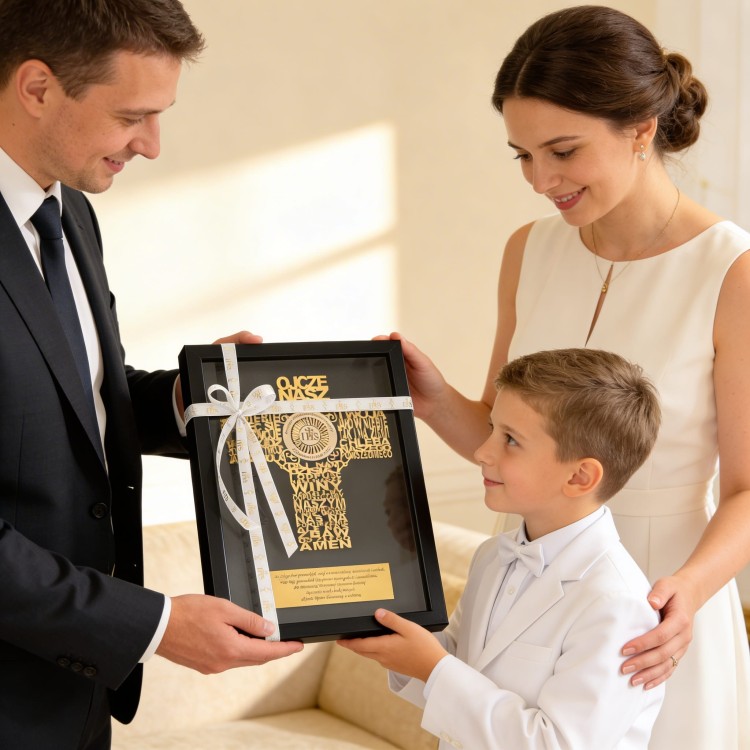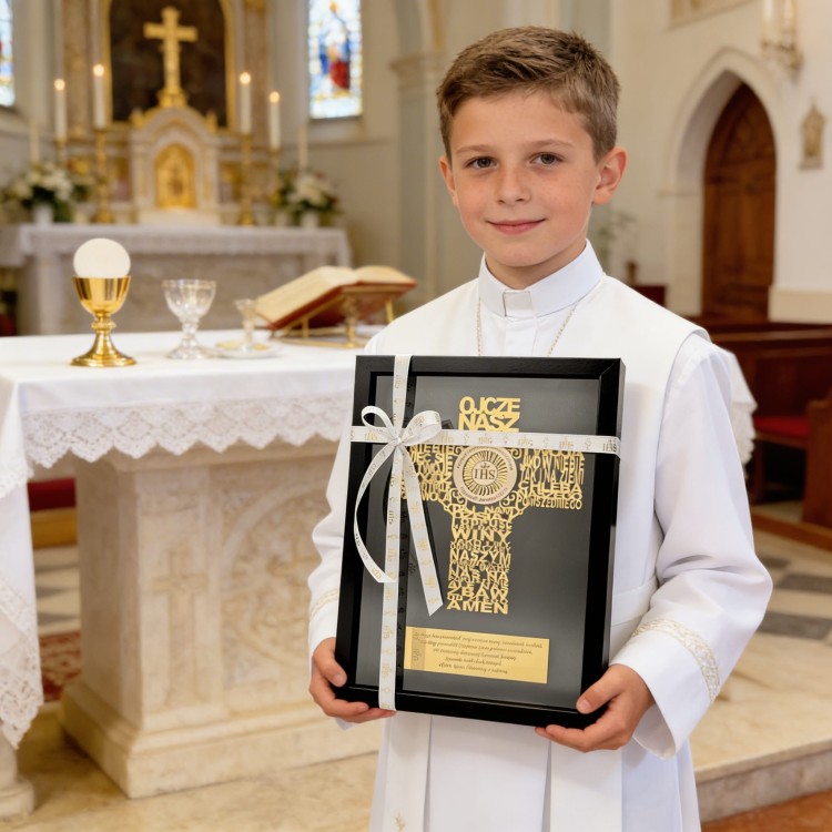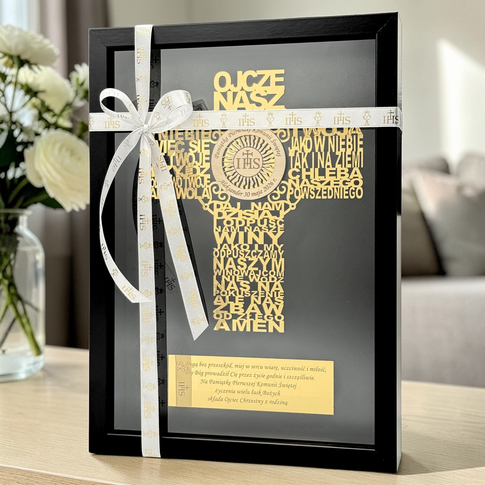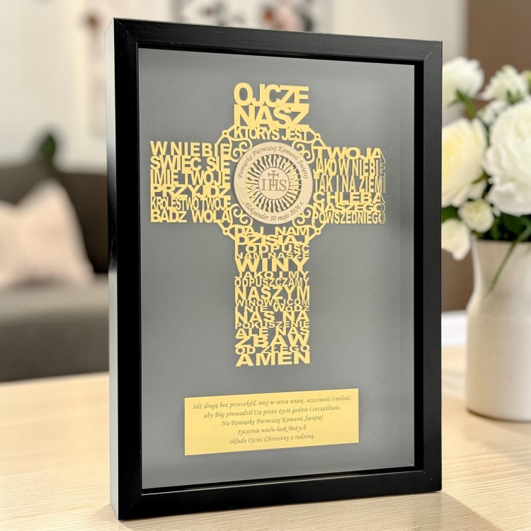 Personalizowany obrazek „Ojcze Nasz” w eleganckiej, głębokiej ramce to wyjątkowa pamiątka Pierwszej Komunii Świętej. Przestrzenny krzyż z wyciętą modlitwą oraz centralna Hostia z możliwością graweru imienia i daty tworzą ponadczasowy, religijny upominek o wysokiej estetyce wykonania. Produkt gotowy do wręczenia – możliwość zawieszenia lub postawienia.