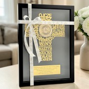 Precyzyjne wycięcie modlitwy w formie krzyża nadaje kompozycji symboliczny i elegancki charakter. Tekst „Ojcze Nasz” tworzy czytelną, przestrzenną strukturę, która przyciąga uwagę i podkreśla religijny wymiar uroczystości.